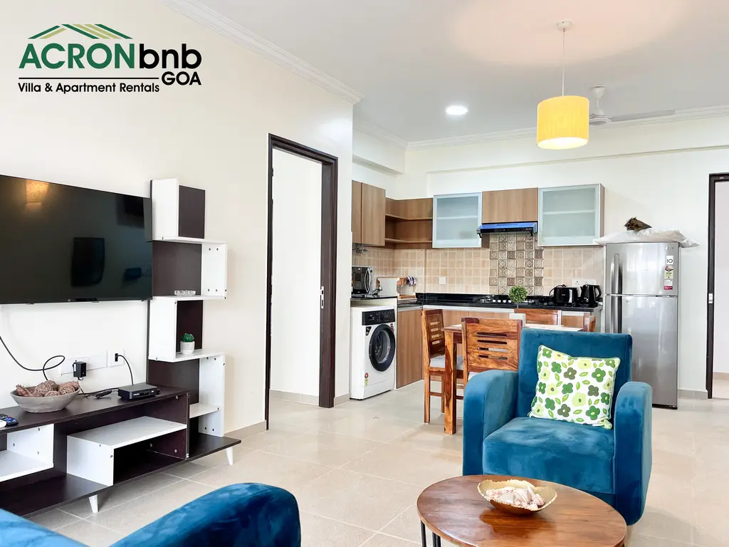 This tranquil haven in the heart of Calangute is a stone’s throw from Calangute Beach. It shares close proximity to many popular eateries, clubs, & supermarkets! It is set in a 24-hour secure gated community that houses 2 large swimming pools, a gym, a steam & sauna room, a yoga room, an outdoor Jacuzzi, & lush gardens! The private 1 BHK Apartment features 1 double bed, split air-conditioner, ensuite bathroom, flat-screen TV, kitchenette, closet space & attached balcony with outdoor seating!